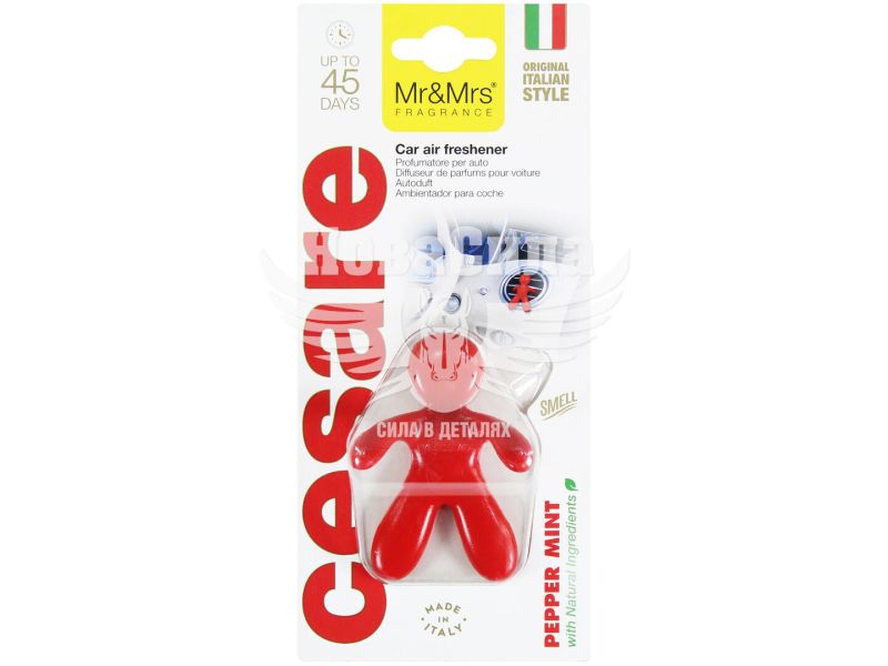 Cesare - популярний автомобільний освіжувач повітря, що містить молекулу тривалої дії з ефірними оліями без вмісту спирту. Нейтралізує небажані неприємні запахи. Зроблений із нетоксичного термопластичного полімеру EVA. Характеристика аромату: Peppermint