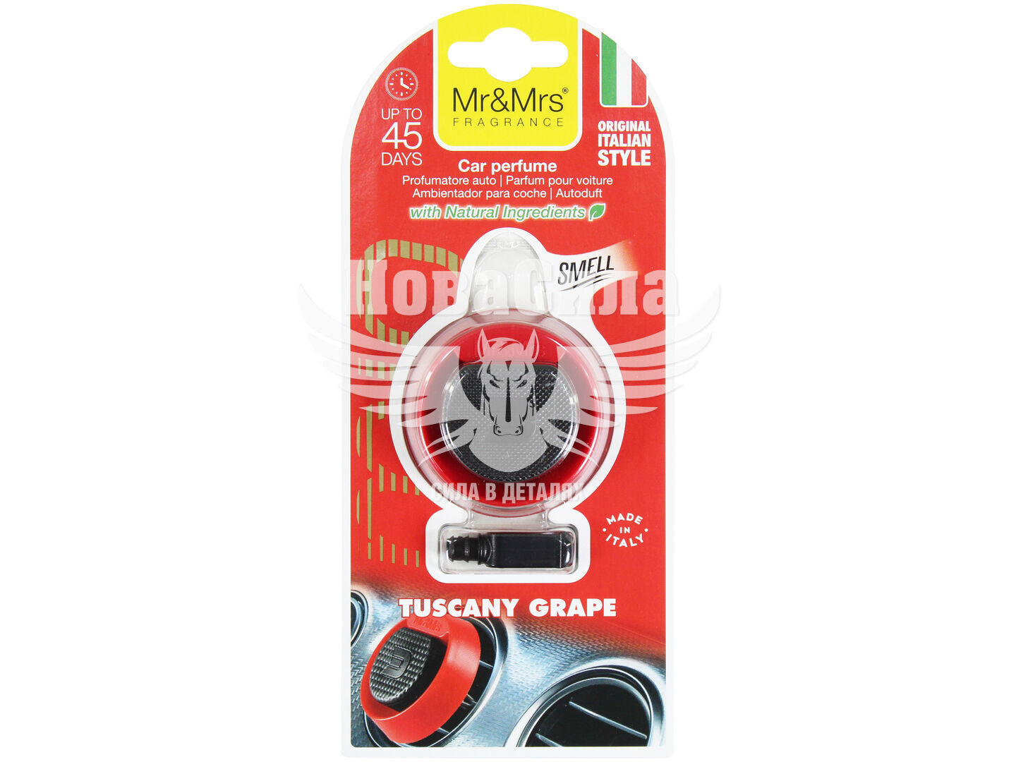 Ароматизатор легко кріпиться до вентиляційної решітки та рівномірно вивільняє аромат під впливом повітряного потоку. Композиція Tuscany Grape — це насичене й багатогранне поєднання нот: спочатку — ягоди, полуниця та неролі, далі — малина, фіалка й магнолія, а в основі — солодка ваніль, мед і легкий деревний акорд берези. Такий аромат наповнює салон теплом і гармонією, створюючи відчуття затишку та стилю. Тривалість дії — до 45 днів.