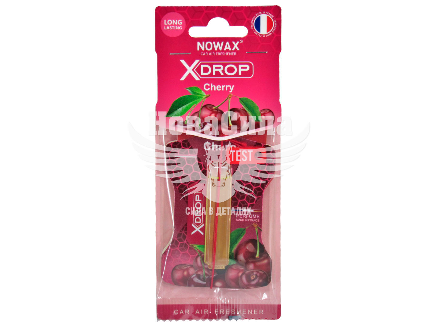 Компактний підвісний автомобільний освіжувач повітря у вигляді картонного листя з невеликим флаконом з ароматичною рідиною. Підходить для підвішування на дзеркала заднього виду або, якщо автомобіль не обладнаний даним дзеркалом, на кріплення сонцезахисного козирка, гачки в салоні або будь-яке інше зручне для водія місце. Ароматизатор завдяки унікальній мембранній системі забезпечує рівномірний розподіл аромату по всьому простору салону, а також виключає проливання при русі по пересіченій місцевості в умовах трясіння. Nowax X Drop Cherry NX00053 має здатність усувати неприємні сторонні запахи, включаючи запах тютюнового диму, вихлопних газів, тварин, поту та багато інших, підвищуючи комфорт водія та пасажирів.