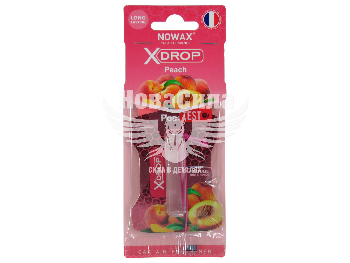 Компактний підвісний автомобільний освіжувач повітря у вигляді картонного листя з невеликим флаконом з ароматичною рідиною. Підходить для підвішування на дзеркала заднього виду або, якщо автомобіль не обладнаний даним дзеркалом, на кріплення сонцезахисного козирка, гачки в салоні або будь-яке інше зручне для водія місце. Ароматизатор завдяки унікальній мембранній системі забезпечує рівномірний розподіл аромату по всьому простору салону, а також виключає проливання при русі по пересіченій місцевості в умовах трясіння. Nowax X Drop Peach NX00058 має здатність усувати неприємні сторонні запахи, включаючи запах тютюнового диму, вихлопних газів, тварин, поту та багато інших, підвищуючи комфорт водія та пасажирів.