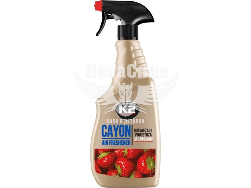 Освіжувач повітря універсальний K2 Cayon Полуниця 700 мл — високоефективний спрей для швидкого усунення неприємних запахів та наповнення приміщення приємним ароматом. Продукт призначений для використання в автомобілі, житлових та комерційних приміщеннях. Завдяки високій концентрації ароматичної композиції забезпечується інтенсивний та тривалий ефект.