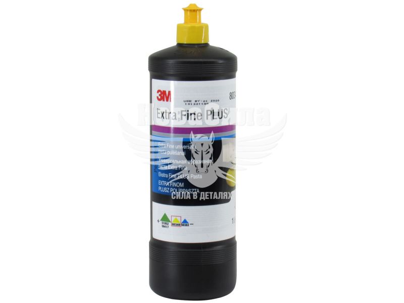 Полірувальна паста 3M 80349 Extra Fine PLUS з жовтим ковпачком - нова полірувальна паста спеціально розроблена для роботи з новими міцними керамічними лаками. Також ефективно працює з 2К емалями. Рекомендується використовувати дану пасту на сухій поверхні спочатку з вовняним полірувальником 01927, а потім з помаранчевим полірувальником 3М 09550.