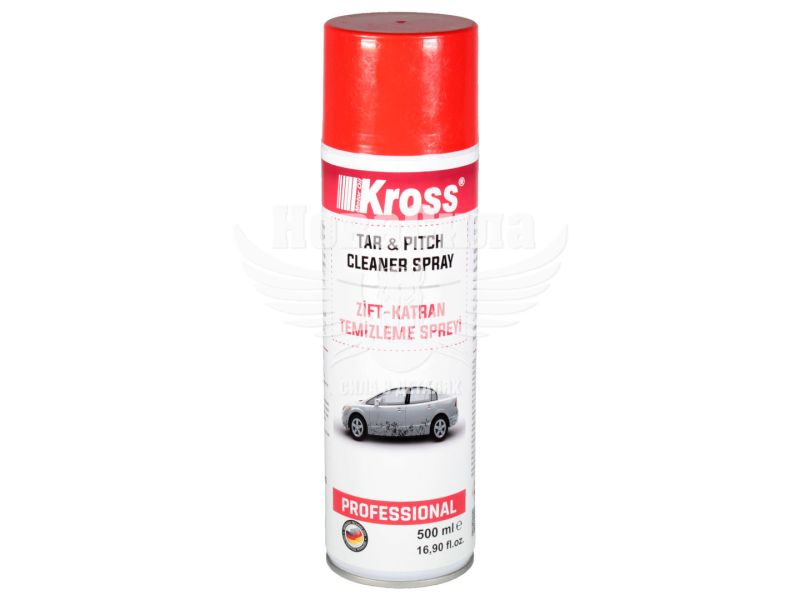 Очисник бітумних плям (Kross) 500мл. — засіб, призначений для швидкого та ефективного очищення поверхонь від плям бітуму, смоли, олив, фарб, мастил, асфальтної крихти, старого поліролю, слідів комах. Використовують для очищення кузова, скла, колісних дисків, бамперів, фар, решіток радіатора, хромованих деталей. Ліквідує забруднення, які не можна очистити шампунем під час миття.