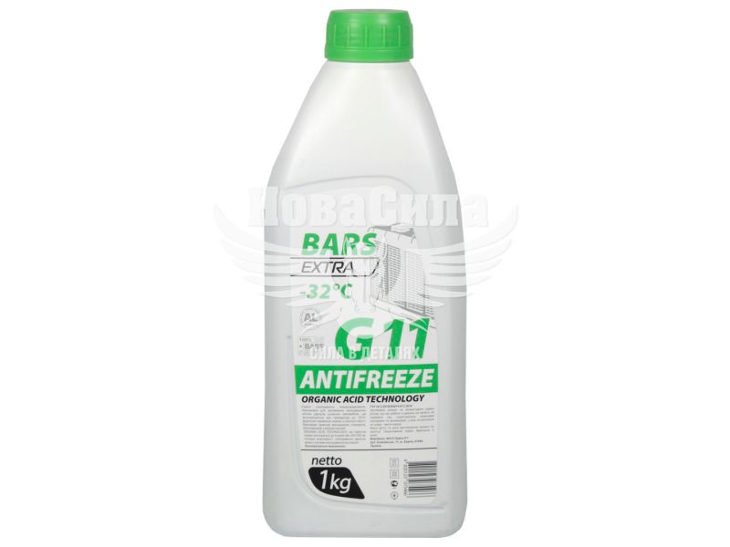 Сучасний антифриз зеленого кольору. Відповідає вимогам класу G11 та універсально підходить для будь-яких систем охолодження, включаючи моделі з радіаторами з алюмінію чи міді. Має високі значення теплоємності і теплоперенесення, за рахунок чого ефективно охолоджує двигун і захищає його від перегріву і пов'язаних з цим проблем під час роботи. Має чудову стійкість до замерзання до -32 градусів, а також стійкість до закипання і рекомендується для цілорічного застосування в будь-яких регіонах, у тому числі з холодними зимами. Антикорозійні присадки, що входять до складу продукту BARS EXTRA зелений -30 C 1кг, захищають систему від іржі та кавітаційної корозії.