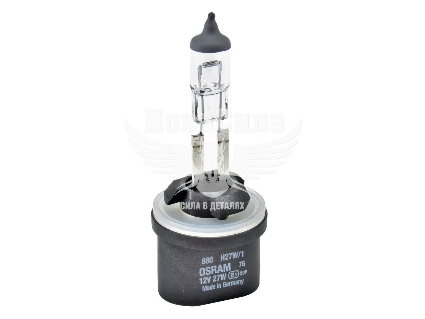 Цоколь типу H27/1, у якого два контакти, з прямим пластмасовим підставою чорного кольору і білим гумовим ущільнювачем, для герметичного встановлення лампочки. Споживаної потужність 27 Вт. Колірна температура 3200 К, що випромінюється світло яскраве, з жовтим відтінком, яке гарантує комфорт при водінні в темний час доби. Колба прозора неокрашенная, виготовлена з якісного скла, воно більш міцне і скорочує вплив шкідливого ультрафіолету.