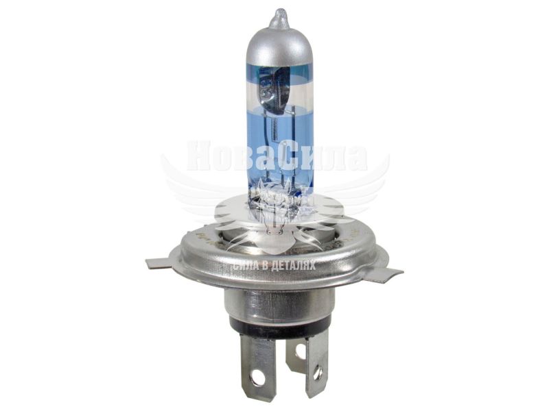 Цоколь типу Н4/P43t, у якого три контакту, має жорсткий допуск на розташування спіралі щодо фланця, що дозволяє розміщувати її точно у фокусі відбивача або на потрібній відстані від нього. При далекому світлі споживана потужність 60 Вт, а при ближньому 55 Вт. Колба частково пофарбована в синій колір, це запатентоване кільце для меншої кількості відбитих відблисків, виготовлена з якісного скла, воно більш міцне і скорочує вплив шкідливого ультрафіолету. Робоча напруга 12 В, застосовність тільки для легкового транспорту.