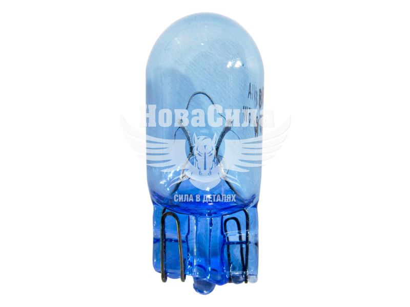 Лампочка галогенова з окрашенною колбою в синій колір, потужністю 5Вт зі світловим потоком 20Лм, дає біле тепле світіння, досить яскраве, для того щоб виконувати свої функції в головній і задній оптиці. Робоча напруга 12В. Термін експлуатації в середньому 4000 годин, це в два рази більше ніж у звичайних лампочок розжарювання.
