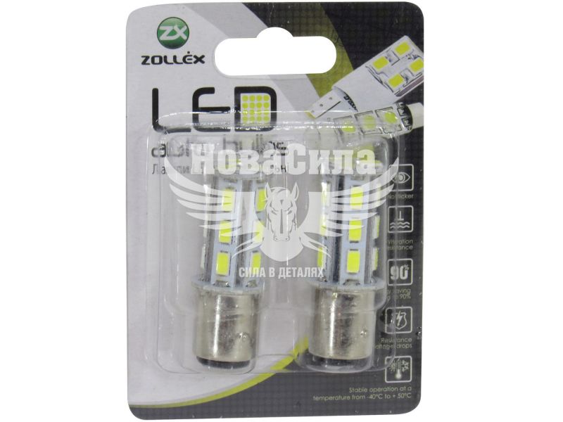 Лампочка 2-ох конт. груша біла LED SMD 12V 18-діодів P21/5W BAY15d (Zollex) (к-т.-2шт.)