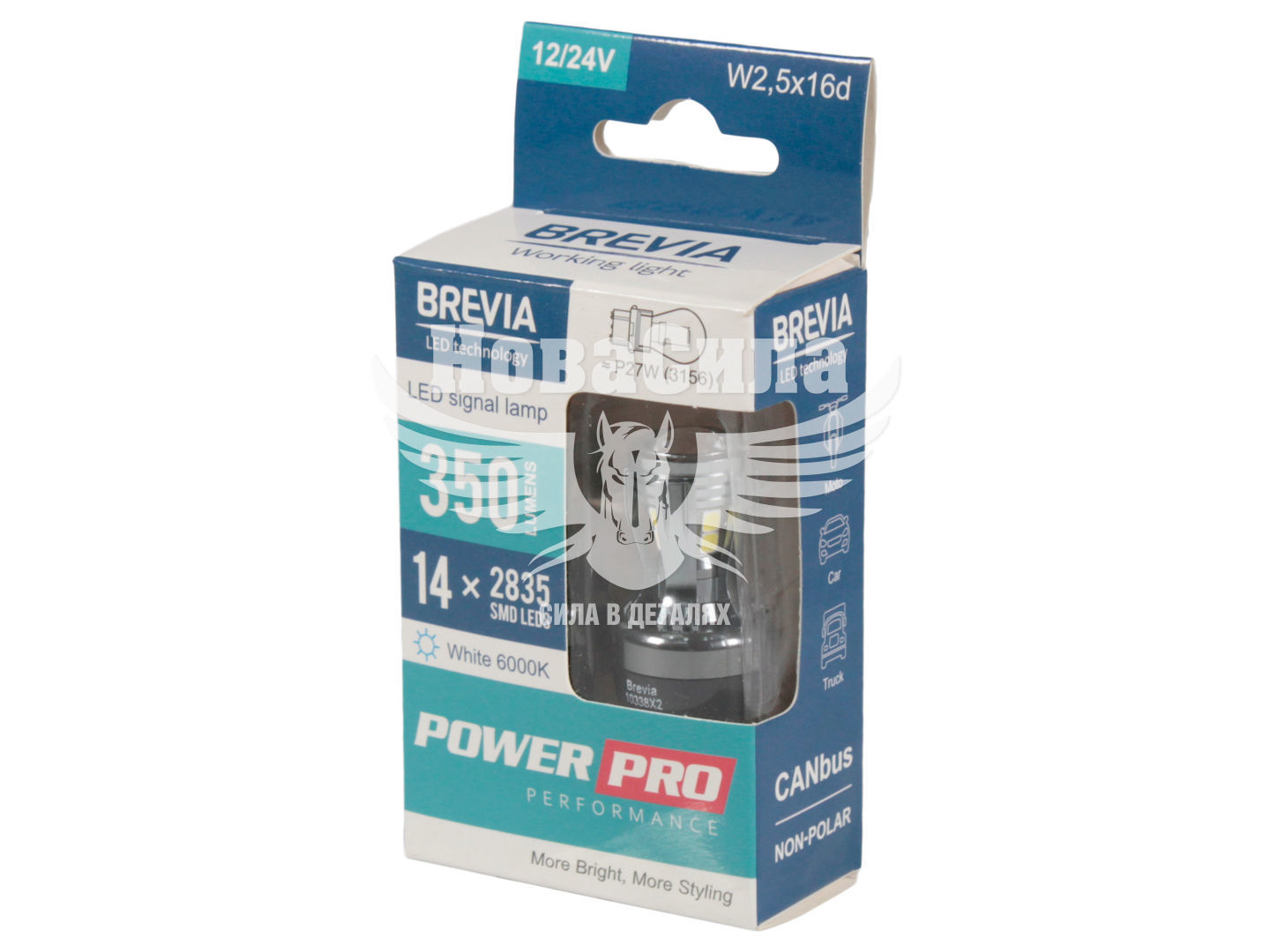 Джерело світла напівпровідниковий світлодіоди 14x2835SMD, підвищеної потужністю, мають високі технологічні характеристики. LED лампа має силу світлового потоку 350 Лм. Світло яскраве білого кольору, з колірною температурою 6000 К, дає блакитний відтінок. Однорідне світіння завдяки якісному матеріалу розсіювача. Робоча напруга 12/24 В для встановлення в легкові автомобілі. Лампочки P27W (3156) із цоколем W2.5x16d. Конструкція лампочок міцна, стійка до ударів та вібрацій, а також з гарною теплопровідністю.