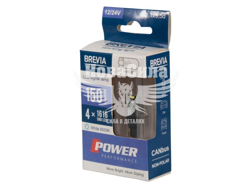 Джерело світла напівпровідниковий світлодіоди 4x1616SMD, підвищеної потужністю, мають високі технологічні характеристики. LED лампа має силу світлового потоку 150 Лм. Світло яскраве білого кольору, з колірною температурою 6000 К, дає блакитний відтінок. Однорідне світіння завдяки якісному матеріалу розсіювача. Робоча напруга 12/24 В для встановлення в легкові автомобілі. Лампочки W5W із цоколем W2.1x9.5d. Конструкція лампочок міцна, стійка до ударів та вібрацій, а також з гарною теплопровідністю.