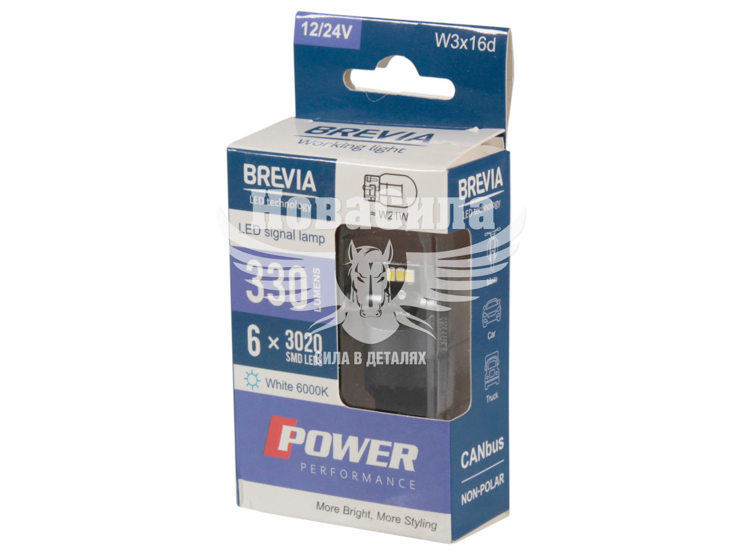 Джерело світла напівпровідниковий світлодіоди 6x3020SMD, підвищеної потужністю, мають високі технологічні характеристики. LED лампа має силу світлового потоку 330 Лм. Світло яскраве білого кольору, з колірною температурою 6000 К, дає блакитний відтінок. Однорідне світіння завдяки якісному матеріалу розсіювача. Робоча напруга 12/24 В для встановлення в легкові автомобілі. Лампочки W21W із цоколем W3x16d. Конструкція лампочок міцна, стійка до ударів та вібрацій, а також з гарною теплопровідністю.