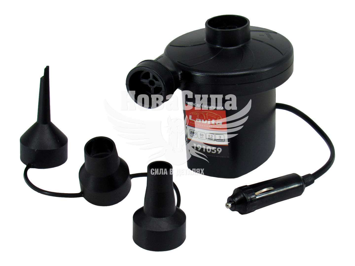 Автомобільний компресор Lavita LA сто дев'яносто одна тисяча п'ятьдесят дев'ять - в комплектації є набір універсальних перехідників, за допомогою яких компресор можна використовувати для накачування велосипедних шин, гумових човнів, матраців, а також дитячих надувних іграшок і спортивних м'ячів.