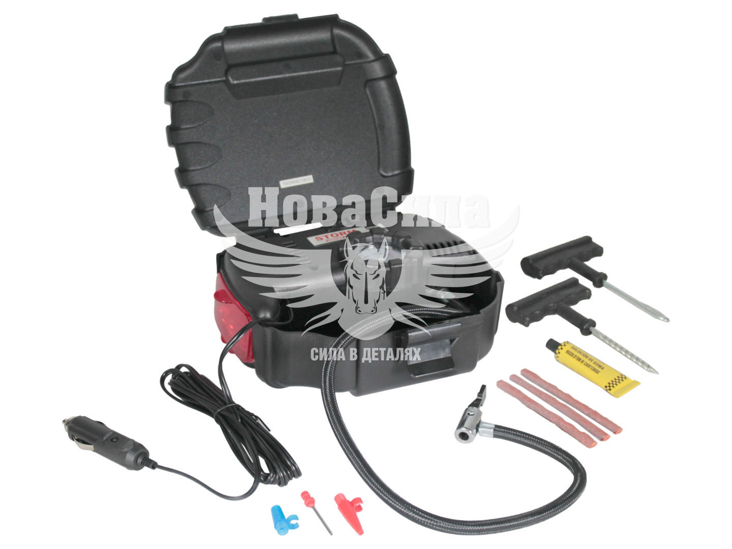 Для автолюбителя, важлива зручна і безпечна експлуатація автомобіля. З різних причин тиск в автомобільних шинах стає менше нормального рівня. Іноді, навіть покупка дорогої і якісної гуми не страхує від проколу шини, або від факту, що рано, чи пізно стиснене повітря може почати проникати через стінки покришки. Кожен автомобіліст повинен знати як впораєтись з цим головним болем. Тому автомобільний компресор STORM Compact Power 20700 + набір для ремонту шин - є невід'ємною річчю в транспортному засобі. Саме він допоможе уникнути випадкового пробиття, або спусщеного колеса. Компресор фірми STORM має здатність нагнітати до 7 атмосфер (кг/см2), що дозволить без проблем підняти тиск в шинах до необхідного рівня. Також він досить швидко накачає ваше колесо R16, біля 7 хвилин, цьому сприяє продуктивність в 12л/хвилину. Однопоршневий компресор оснащений аналоговим манометром, орієнтуючись на його показання ви з легкістю зможете підняти тиску до рекомендованого. У комплекті також йде довгий мідний кабель живлення (3м), міцний шланг (0,51м), що дозволить доставляти прилад до кожного колеса. Максимальний струм живлення становить 7 А. Також автокомпресор має ліхтарик, для зручної роботи в темний час доби. Корпус виконаний з ударостійкого пластику, що дозволить вам комфортно і довго експлуатувати даний компресор. Корпус має форму кейсу, для зручного зберігання та транспортування.