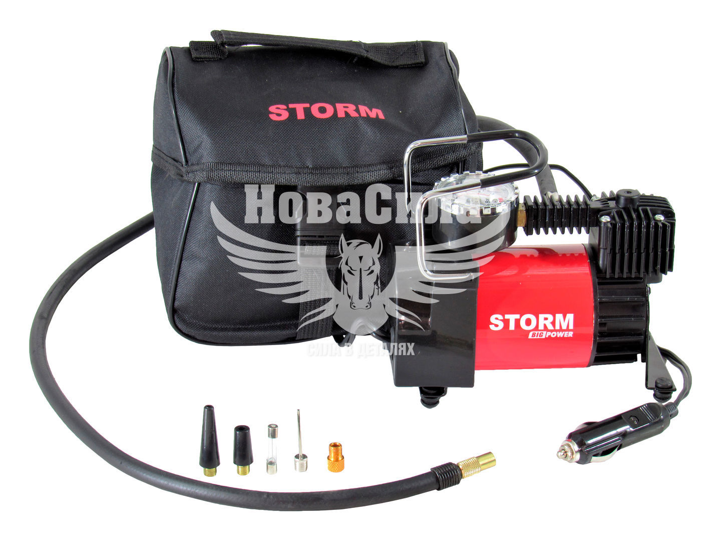 Автомобільний компресор STORM Big Power AUTOSTOP 20320 для використання в сучасних легкових автомобілях з напругою бортової електромережі 12 вольт. Корпус даного компресора виготовлений з комбінації металу і пластика. Зверху встановлена надійна транспортувальна ручка. Компресор оснащений манометром який жорстко закріплений на корпусі, для захисту від механічних пошкоджень. На ніжках встановлені гумові демпфери, які гасять вібрацію в процесі роботи компресора. Компактні габаритні розміри і невелика вага виробу, в поєднанні з високою продуктивністю і надійністю, забезпечують позитивні відгуки у власників. Максимальний тиск, який здатен видавати даний компресор, становить 10 атмосфер, чого цілком достатньо для побутових цілей. Споживана потужність 170 Ватт, а продуктивність 37 л/хв. Кабель для підключення до електромережі автомобіля становить 3 метри, чого цілком достатньо для комфортного використання. Серед особливостей слід відзначити функцію автостопу при досягненні заданих параметрів тиску в шинах.