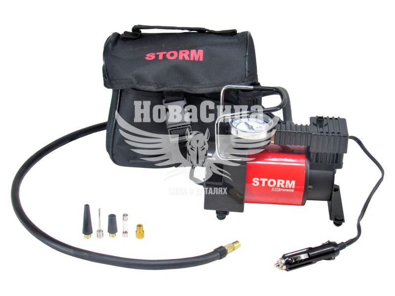 Автомобільний компресор STORM Big Power 20300 для використання в сучасних легкових автомобілях з напругою бортової електромережі 12 вольт. Корпус даного компресора виготовлений з комбінації металу і пластика. Зверху встановлена надійна транспортувальна ручка. Компресор оснащений манометром який жорстко закріплений на корпусі, для захисту від механічних пошкоджень. На ніжках встановлені гумові демпфери, які гасять вібрацію в процесі роботи компресора. Компактні габаритні розміри і невелика вага виробу, в поєднанні з високою продуктивністю і надійністю, забезпечують позитивні відгуки у власників. Максимальний тиск, який здатен видавати даний компресор, становить 10 атмосфер, чого цілком достатньо для побутових цілей. Споживана потужність 170 Ватт, а продуктивність 37 л/хв. Кабель для підключення до електромережі автомобіля становить 3 метри, чого цілком достатньо для комфортного використання.