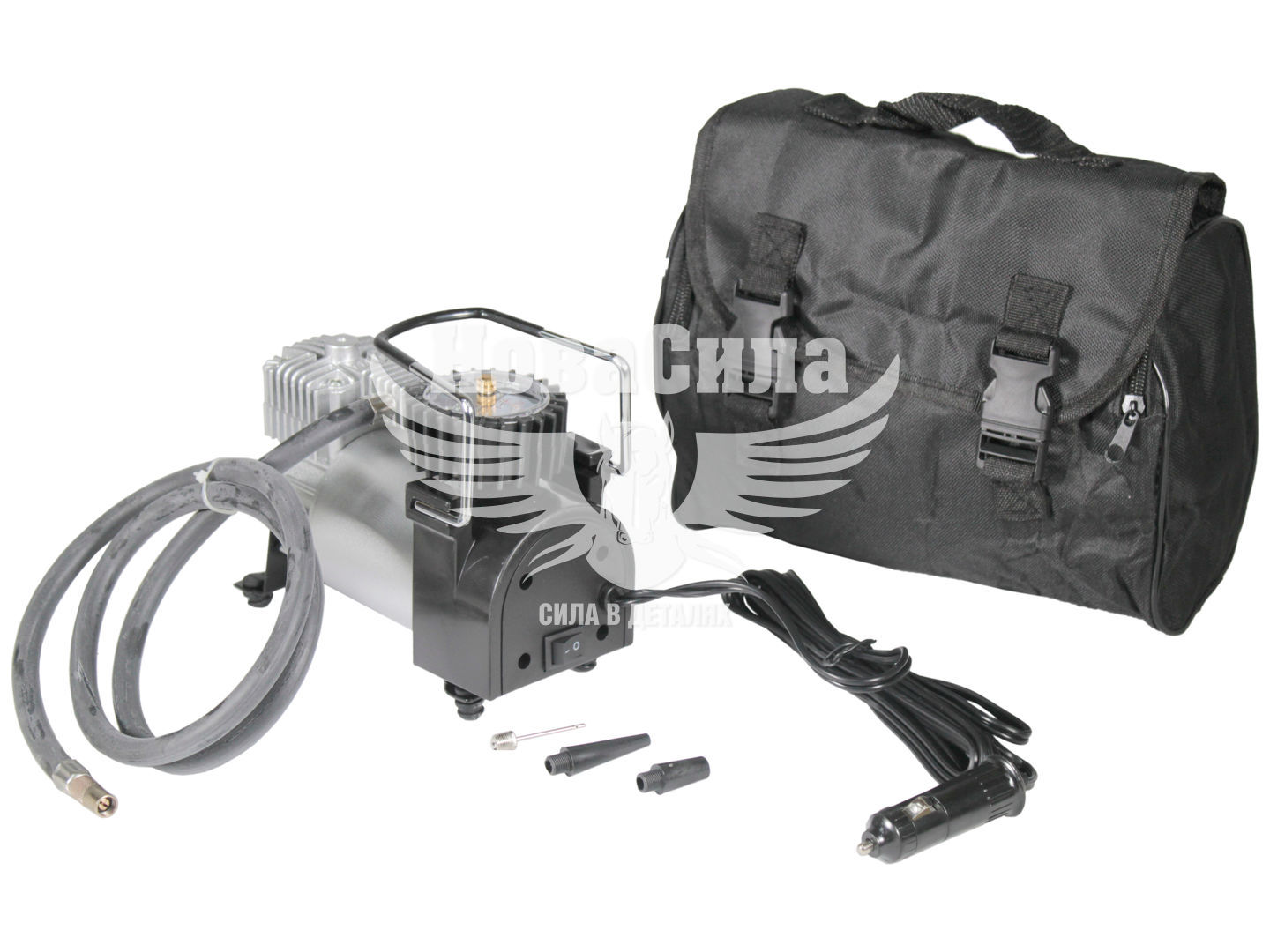 Автокомпресор, Шланг гумовий високого тиску з набором адаптерів, Сумка для зберігання і транспортування, Інструкція з експлуатації, пакувальна коробка.