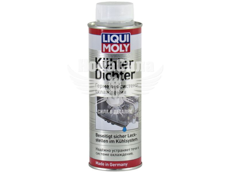 Герметик системи охолодження Liqui Moly Kuhler Dichter. Герметизує невеликі місця витоків в радіаторі, пористість металу в місцях пайки, волосяні тріщини. Герметизує пошкодження, які досить важко локалізувати (при цьому можна визначити лише падіння рівня охолоджуючої рідини). Дана присадка швидко усуває витоку. Захищає камеру згоряння від можливого попадання в неї охолоджуючої рідини. Можна використовувати засіб з усіма видами присадок в систему охолодження і будь-якими антифризами. Застосування: для всіх систем охолодження і нагрівання без водяного фільтра. Стосується в системах охолодження з алюмінію та пластиків. Перед використанням балончик струсити. Прогріти двигун і додати герметик в систему охолодження з розрахунку 250 мл присадки на 10 л охолоджуючої рідини. Дати попрацювати двигуну на холостих обертах мінімум 10 хвилин.