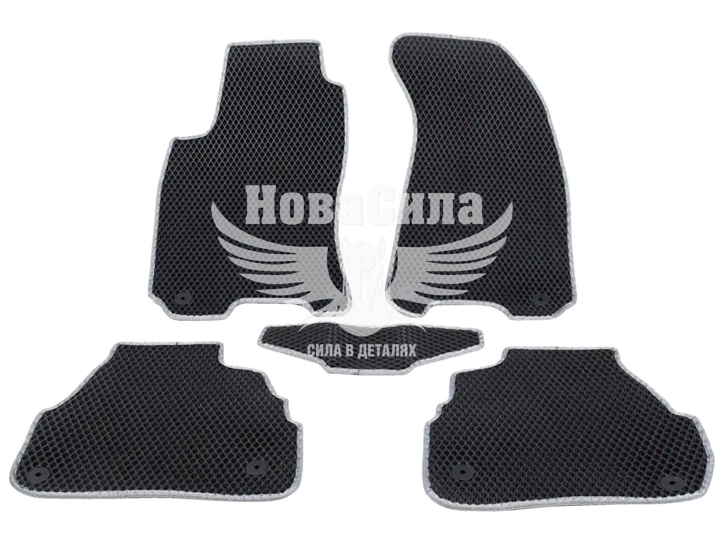 Виготовлені з сучасного матеріалу EVA (етилвінілацетат), який поєднує легкість, еластичність і високу зносостійкість. Комірчаста структура ефективно утримує воду, пісок та сміття, запобігаючи їх поширенню по салону.