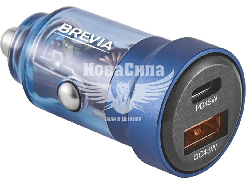 Зарядне для портативних пристроїв 12-24V (Brevia) 1USB-A, 1USB-C, 45W, прозоре синє