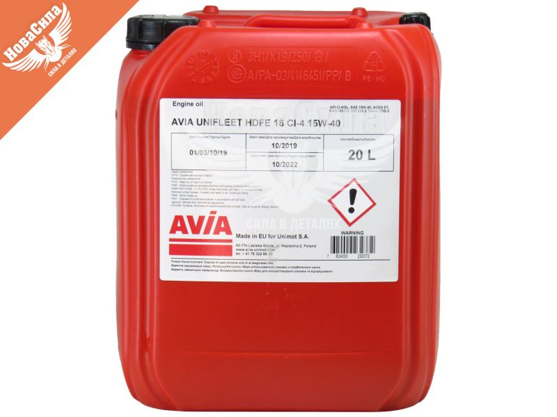 AVIA Unifleet HDFE18 15W-40 - моторне масло типу SHPD (Super High Performance Diesel) для всесезонного застосування на працюючих при підвищених навантаженнях дизельних двигунах з наддувом і без нього в вантажних автомобілях, сільськогосподарських (JOHN DEERE, CLAAS, MASSEY FERGUSON, CASE, INTERNETIONAL HARVESTER , RENAULT, DEUTZ NEW HOLLAND / FORD / FIAT AGRI ...) і будівельних машинах, а також автобусах (слідувати виробничими інструкціями!)