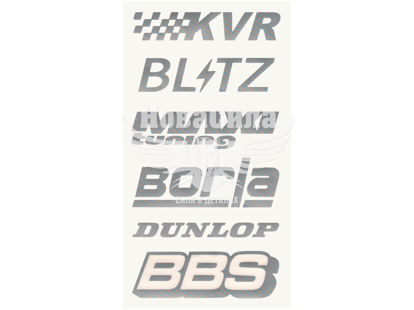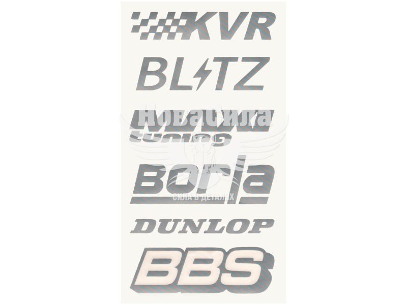 Наклейка з написом в ряд (KVR, BL-TZ, MAXI, BORLA, DUNLOP, BBS) (срібн.) 28х14