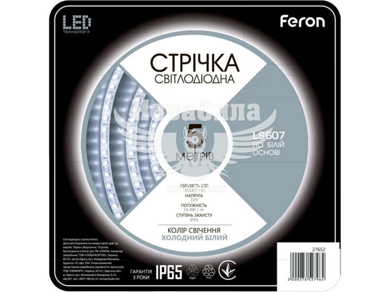 Світлодіодна стрічка Feron LS607 12В 14.4Вт/м холодний білий модель 27652 — це потужна та герметична світлодіодна стрічка в силіконовій оболонці зі ступенем захисту IP65. Модель оснащена 60 світлодіодами 5050SMD на метр, що забезпечує інтенсивне яскраве світіння холодного білого відтінку, ідеальне для функціонального та декоративного освітлення.