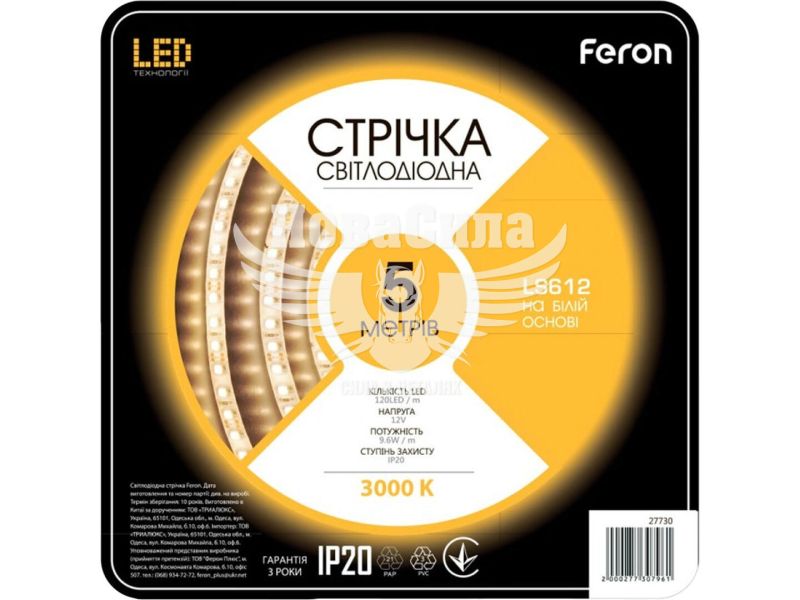 Світлодіодна стрічка Feron LS612 12В 9.6Вт/м теплий білий модель 27730 — це високоякісна LED стрічка відкритого типу IP20, призначена для внутрішнього декоративного та робочого освітлення. Висока щільність у 120 світлодіодів на метр забезпечує м’яке, рівномірне й приємне тепле біле світіння, яке ідеально підходить для підсвітки ніш, меблів, інтер’єрних конструкцій, полиць, вітрин та інших декоративних елементів.