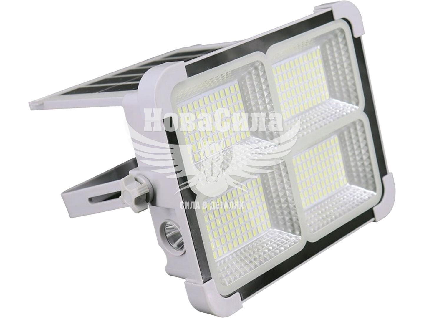 Міцний пластиковий корпус сірого кольору, скляний розсіювач, зручна ручка з обертанням на 180°, гачки для підвішування та потужні магніти забезпечують зручний монтаж. Світильник підтримує два режими яскравості, аварійний сигнал, має індикатор заряду та функцію Powerbank з USB-виходом. Боковий ліхтар і гніздо для встановлення на штатив розширюють можливості використання.