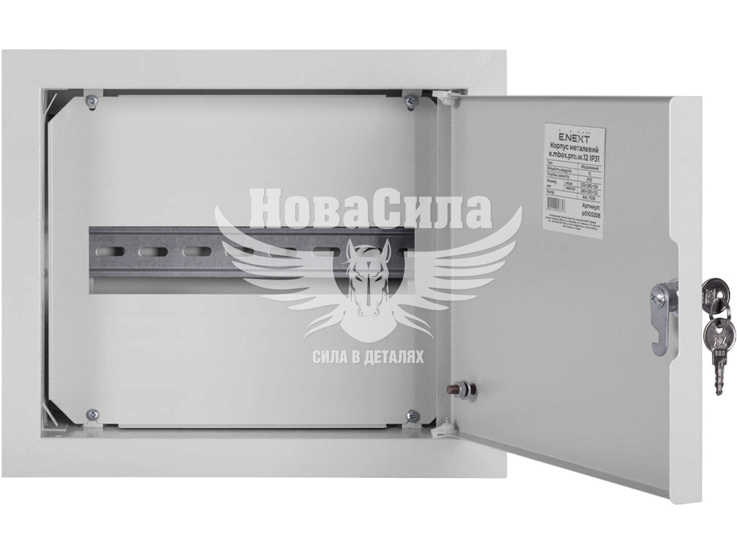Корпус оснащений непрозорими металевими дверцятами із замком, що обмежує несанкціонований доступ та підвищує рівень електробезпеки. Внутрішня конструкція передбачає монтаж DIN-рейки для надійного та зручного кріплення модульних пристроїв.
