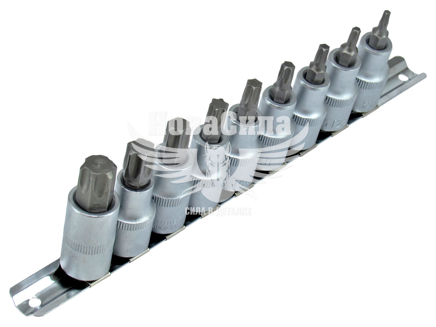 Головки поставляються на металевій планці, яка служить зручним аксесуаром для зберігання набору. Планку для зручності можна закріпити на стіні в майстерні або гаражі.