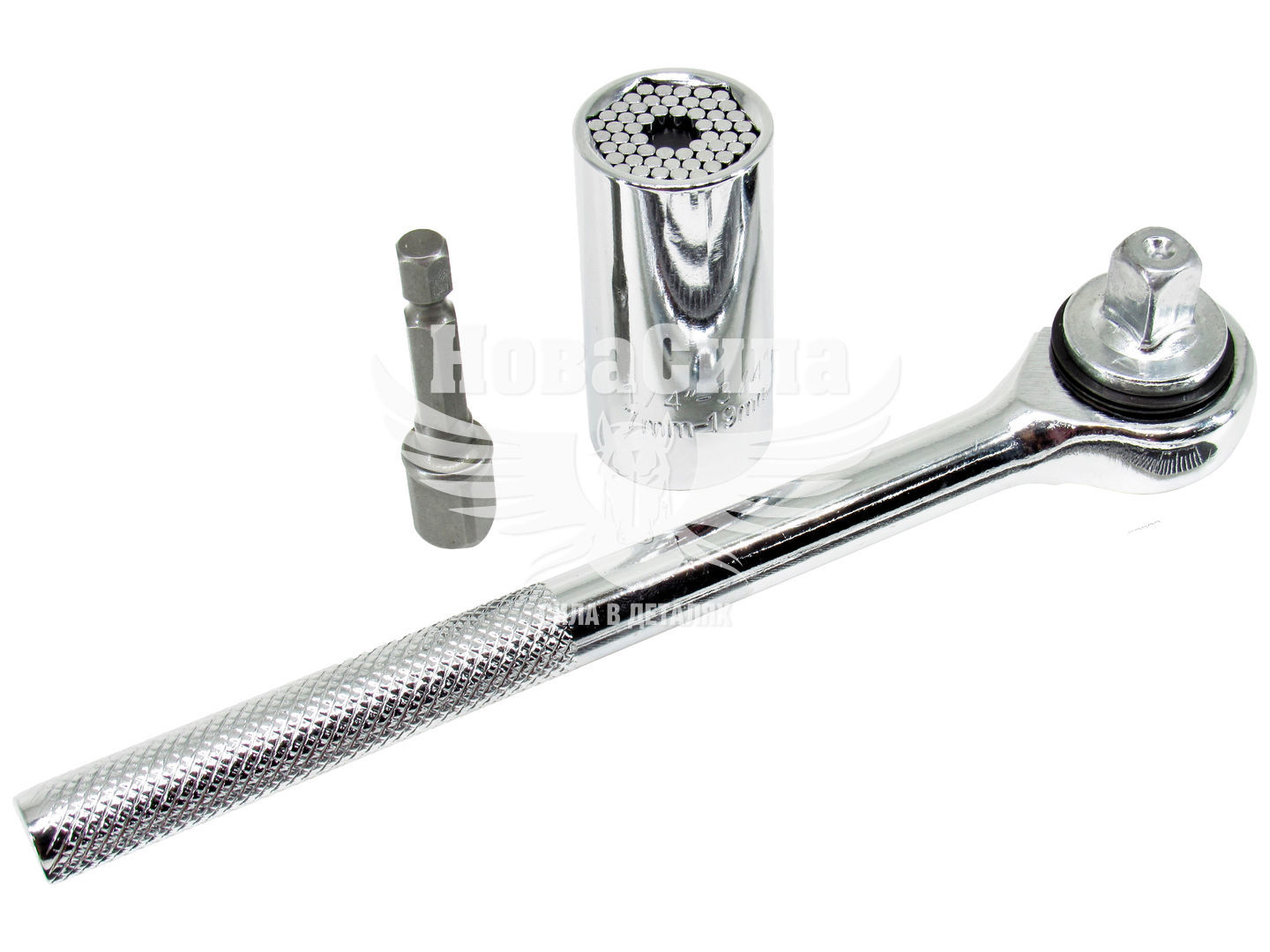 Цей інструмент зможе замінити цілий набір торцевих головок. Висувні підпружинені Піни з високоміцної легованої сталі дозволяють передати великий крутний момент на головку шестигранного болта. При з'єднанні робочої частини універсальної головки з болтом, частина висувних пинов утапливается всередину, а залишилися зовні щільно прилягають до шестигранною голівці, створюючи тим самим надійне з'єднання.