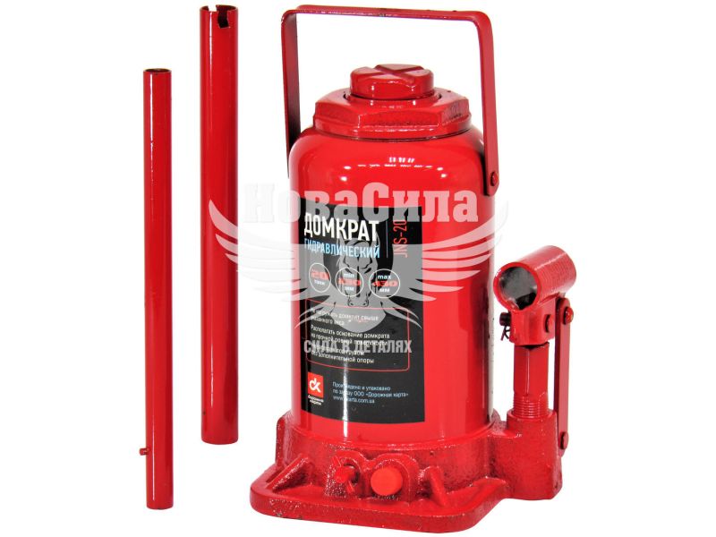 Гідравлічний домкрат DK JNS-20 - універсальний вантажопідйомний механізм, призначений для підйому, утримання і фіксації автомобіля, в процесі проведення ремонтних і діагностичних робіт. Модель JNS-20 пляшкового типу, має максимальну вантажопідйомність 20тонн, що цілком достатньо для вантажного автомобіля чи автобуса. Перевагою даного домкрата є хороша висота підйому 430мм і висота підхоплення 185мм, що дозволяє розширити область застосування і ефективно виконувати ремонтні роботи. Подовжена металева приводная ручка, складаний конструкції, передає посилення на нагнітає насос, де нагнітається робоча рідина, яка забезпечує плавний хід при здійсненні підйому і опускання вантажу. Конструкція домкрата представлена ??в формі пляшки, корпус якого виконаний з міцного металу. Поверхня корпусу покрита спеціальним лакофарбовим покриттям, для запобігання процесу корозії металу і забезпечує тривалий термін служби пристрою. Завдяки широкій опорній поверхні, домкрат досить стійкий і захищений від бокового ковзання.