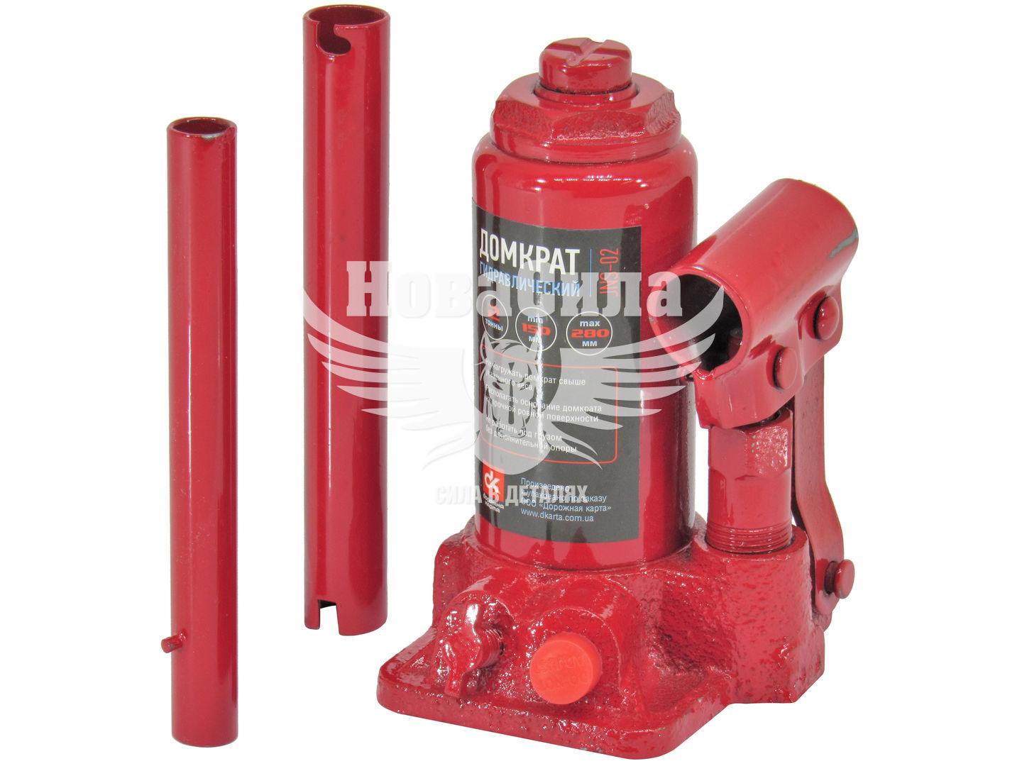 Гідравлічний домкрат DK DK JNS-02 - універсальний вантажопідйомний механізм, призначений для підйому, утримання і фіксації автомобіля, в процесі проведення ремонтних і діагностичних робіт. МодельDK JNS-02 пляшкового типу, має максимальну вантажопідйомність 2тонни, що цілком достатньо для легкового автомобіля. Перевагою даного домкрата є хороша висота підйому 280мм і висота підхоплення 150мм, що дозволяє розширити область застосування і ефективно виконувати ремонтні роботи. Подовжена металева приводная ручка, складаний конструкції, передає посилення на нагнітає насос, де нагнітається робоча рідина, яка забезпечує плавний хід при здійсненні підйому і опускання вантажу. Конструкція домкрата представлена ??в формі пляшки, корпус якого виконаний з міцного металу. Поверхня корпусу покрита спеціальним лакофарбовим покриттям, для запобігання процесу корозії металу, що забезпечить тривалий термін служби пристрою. Завдяки широкій опорній поверхні, домкрат досить стійкий і захищений від бокового ковзання.