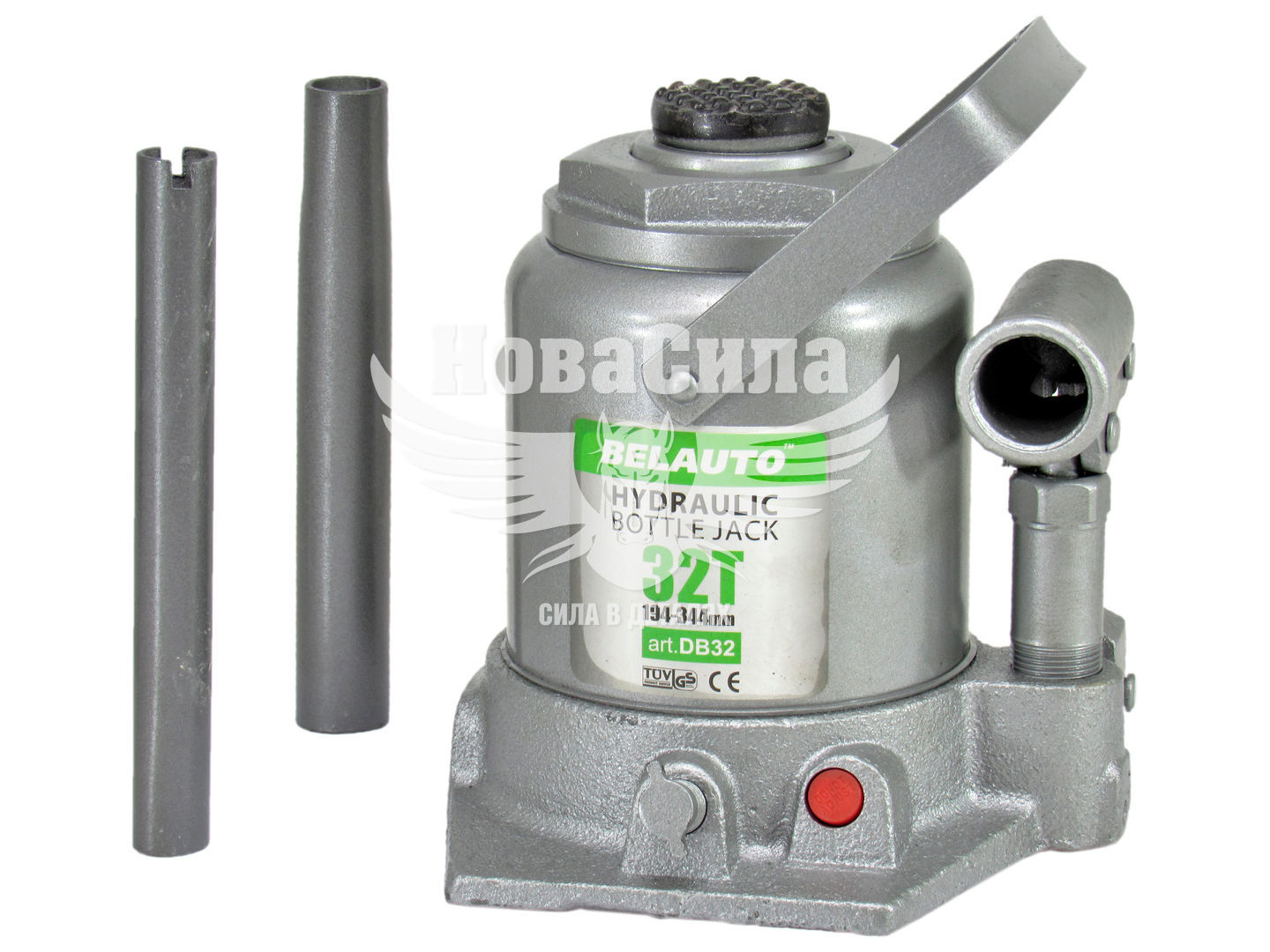 Гідравлічний домкрат БЕЛАВТО DB32 - універсальний вантажопідйомний механізм, призначений для підйому, утримання і фіксації автомобіля, в процесі проведення ремонтних і діагностичних робіт. Модель DB32 пляшкового типу, має максимальну вантажопідйомність 32тонни, що цілком достатньо для вантажного автомобіля чи автобуса. Перевагою даного домкрата є хороша висота підйому 344мм і висота підхоплення 194мм, що дозволяє розширити область застосування і ефективно виконувати ремонтні роботи. Подовжена металева приводная ручка, складаний конструкції, передає посилення на нагнітає насос, де нагнітається робоча рідина, яка забезпечує плавний хід при здійсненні підйому і опускання вантажу. Конструкція домкрата представлена в формі пляшки, корпус якого виконаний з міцного металу. Поверхня корпусу покрита спеціальним лакофарбовим покриттям, для запобігання процесу корозії металу і забезпечує тривалий термін служби пристрою. Завдяки широкій опорній поверхні, домкрат досить стійкий і захищений від бокового ковзання.