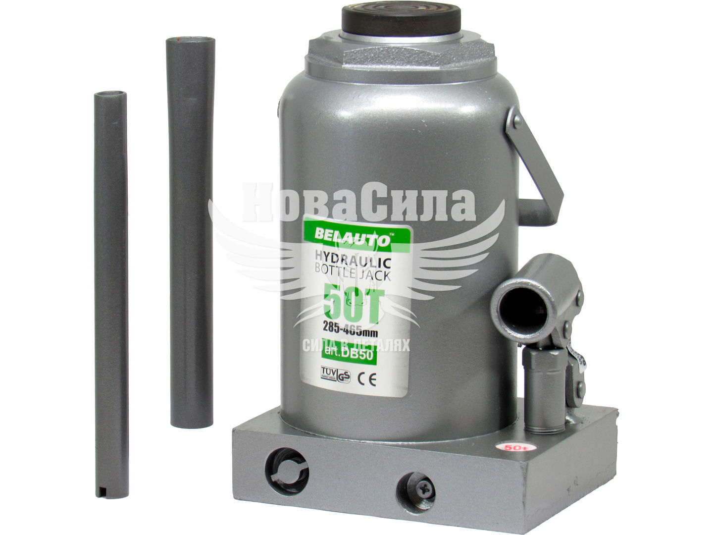 Гідравлічний домкрат БЕЛАВТО DB50 - універсальний вантажопідйомний механізм, призначений для підйому, утримання і фіксації автомобіля, в процесі проведення ремонтних і діагностичних робіт. Модель DB50 пляшкового типу, має максимальну вантажопідйомність 50тонн, що цілком достатньо для вантажного автомобіля чи автобуса. Перевагою даного домкрата є хороша висота підйому 465мм і висота підхоплення 285мм, що дозволяє розширити область застосування і ефективно виконувати ремонтні роботи. Подовжена металева приводная ручка, складаний конструкції, передає посилення на нагнітає насос, де нагнітається робоча рідина, яка забезпечує плавний хід при здійсненні підйому і опускання вантажу. Конструкція домкрата представлена в формі пляшки, корпус якого виконаний з міцного металу. Поверхня корпусу покрита спеціальним лакофарбовим покриттям, для запобігання процесу корозії металу і забезпечує тривалий термін служби пристрою. Завдяки широкій опорній поверхні, домкрат досить стійкий і захищений від бокового ковзання.