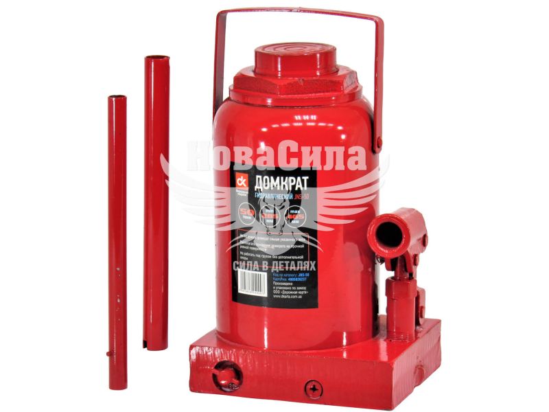 Гідравлічний домкрат DK JNS-50 - універсальний вантажопідйомний механізм, призначений для підйому, утримання і фіксації автомобіля, в процесі проведення ремонтних і діагностичних робіт. Модель JNS-50 пляшкового типу, має максимальну вантажопідйомність 50тонни, що цілком достатньо для вантажного автомобіля чи фури. Перевагою даного домкрата є хороша висота підйому 465мм і висота підхоплення 285мм, що дозволяє розширити область застосування і ефективно виконувати ремонтні роботи. Подовжена металева приводная ручка, складаний конструкції, передає посилення на нагнітає насос, де нагнітається робоча рідина, яка забезпечує плавний хід при здійсненні підйому і опускання вантажу. Конструкція домкрата представлена ??в формі пляшки, корпус якого виконаний з міцного металу. Поверхня корпусу покрита спеціальним лакофарбовим покриттям, для запобігання процесу корозії металу і забезпечує тривалий термін служби пристрою. Завдяки широкій опорній поверхні, домкрат досить стійкий і захищений від бокового ковзання.