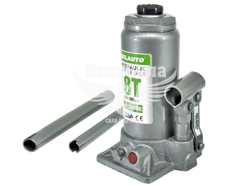 Гідравлічний домкрат БЕЛАВТО DB08 - універсальний вантажопідйомний механізм, призначений для підйому, утримання і фіксації автомобіля, в процесі проведення ремонтних і діагностичних робіт. Модель DB08 пляшкового типу, має максимальну вантажопідйомність 8тонни, що цілком достатньо для легкового автомобіля чи мікроавтобуса. Перевагою даного домкрата є хороша висота підйому 385мм і висота підхоплення 200мм, що дозволяє розширити область застосування і ефективно виконувати ремонтні роботи. Подовжена металева приводная ручка, складаний конструкції, передає посилення на нагнітає насос, де нагнітається робоча рідина, яка забезпечує плавний хід при здійсненні підйому і опускання вантажу. Конструкція домкрата представлена в формі пляшки, корпус якого виконаний з міцного металу. Поверхня корпусу покрита спеціальним лакофарбовим покриттям, для запобігання процесу корозії металу і забезпечує тривалий термін служби пристрою. Завдяки широкій опорній поверхні, домкрат досить стійкий і захищений від бокового ковзання.