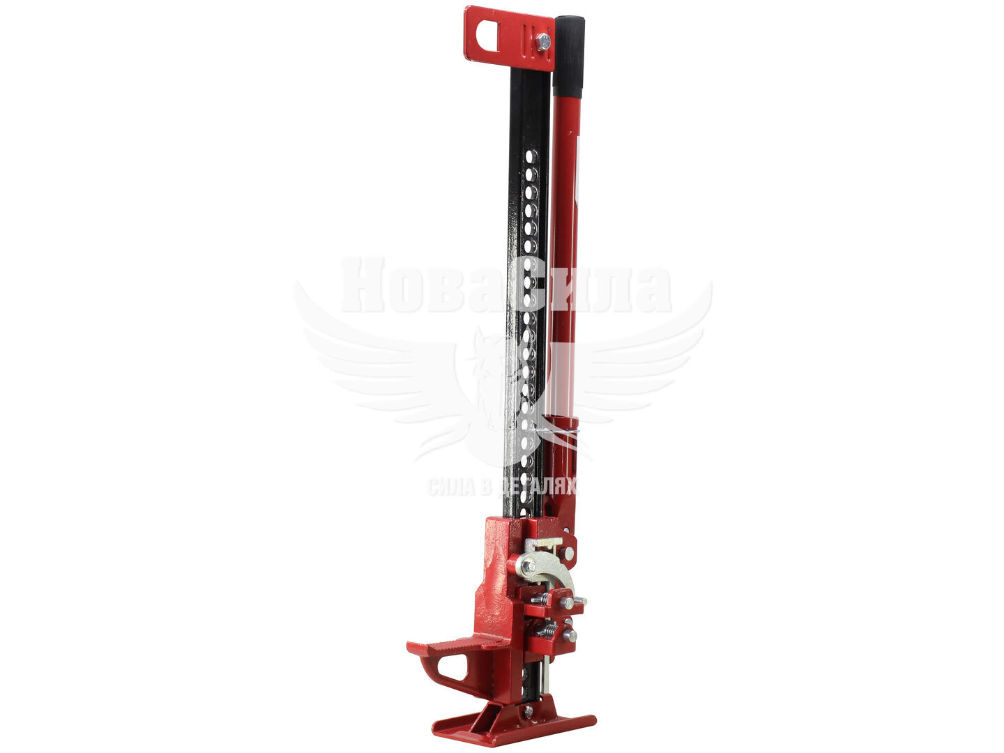 Основним елементом конструкції є вертикальна рейка з отворами для фіксації, вздовж якої рухається підйомний механізм. Це дозволяє точно контролювати висоту підйому і надійно фіксувати вантаж у потрібному положенні. Металева підйомна поверхня гарантує міцність та стійкість до великих навантажень, забезпечуючи довговічність інструмента. Приводна ручка робить процес підйому простим і зручним, навіть при максимальних навантаженнях.