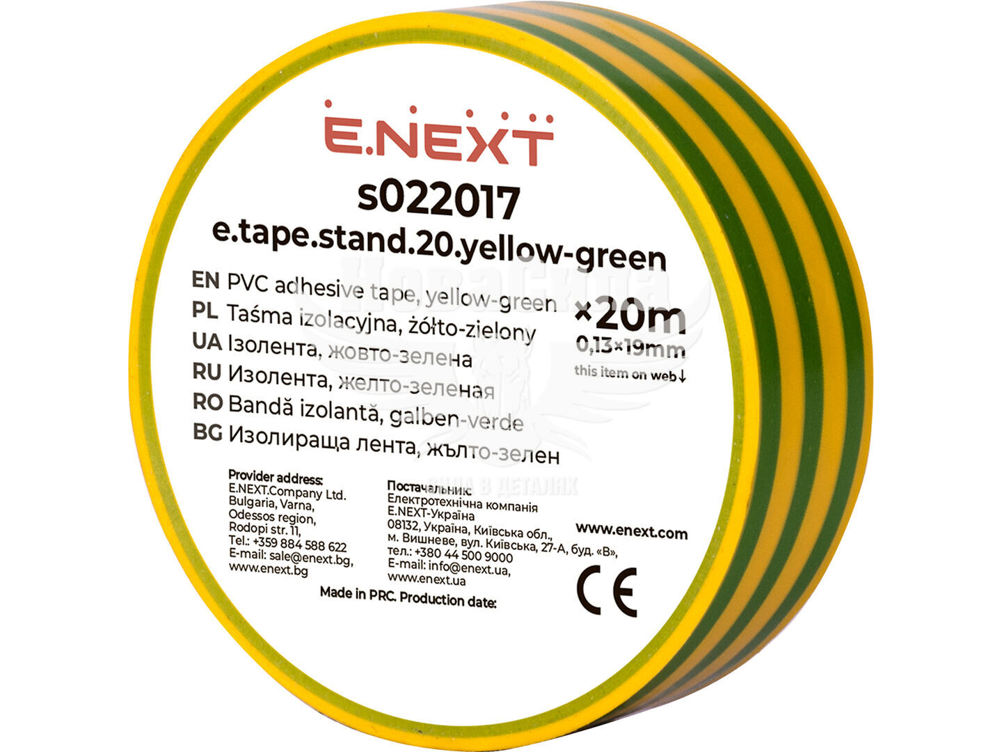 Стрічка має товщину 0,13 мм і ширину 19 мм, що забезпечує зручність у роботі, достатню еластичність і щільне прилягання до поверхні провідників. Довжина рулону становить 20 м, що дозволяє виконувати значний обсяг електромонтажних робіт без частого використання додаткових матеріалів. Жовто-зелений колір відповідає загальноприйнятому маркуванню захисного заземлення та використовується для ідентифікації PE-провідників.