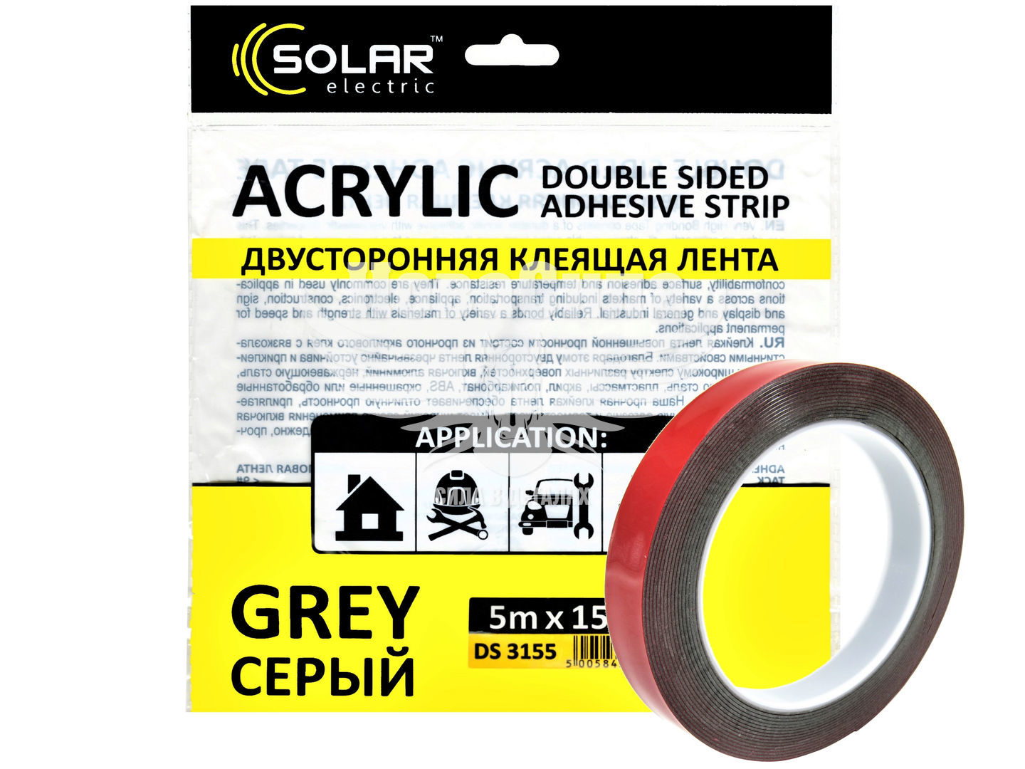Скотч двохстор. 15мм. 5м. (Solar) Acrylic (сірий підс.)