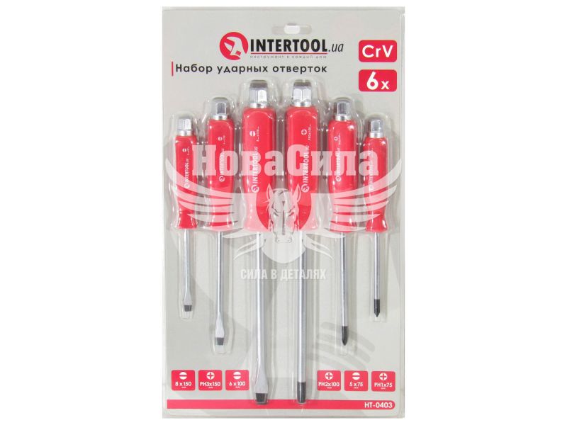 Набір ударних викруток ТМ INTERTOOL HT-0403 застосовується для відкручування заржавілих і прикипіла гвинтів і саморізів. Цей тип викруток в основному призначений для побутового використання, хоча і в інших виробничих галузях ці викрутки себе зарекомендували позитивним чином. Хвостовики викруток виготовлені з хром-ванадієвої сталі, яка забезпечує високі експлуатаційні показники і захист від корозії. У наборі НТ-0403 шість викруток з насадками: SL5, SL6, SL8; PH1, PH2, PH3