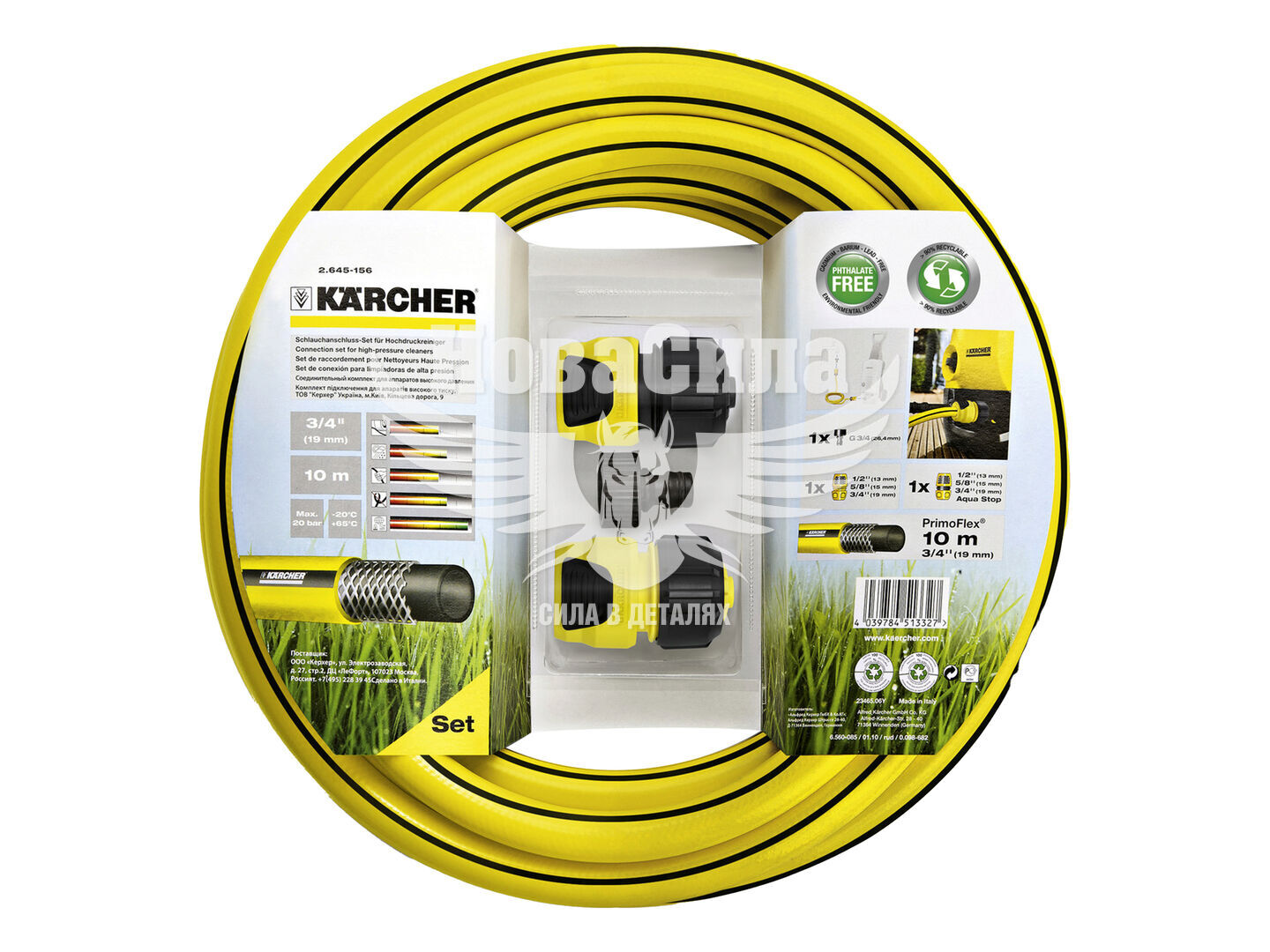 Комплект для підключення мінімийки 2.645-156.0 — універсальний набір для подачі води до апаратів високого тиску Karcher або для поливу саду. Включає шланг PrimoFlex 3/4 дюйма довжиною 10 м, два універсальних конектори (один із функцією Aqua Stop) і штуцер із різьбою G3/4, G1/2. Шланг виготовлений без фталатів, що забезпечує безпеку та довговічність. Конструкція гарантує гнучкість, міцність і стійкість до зламів.