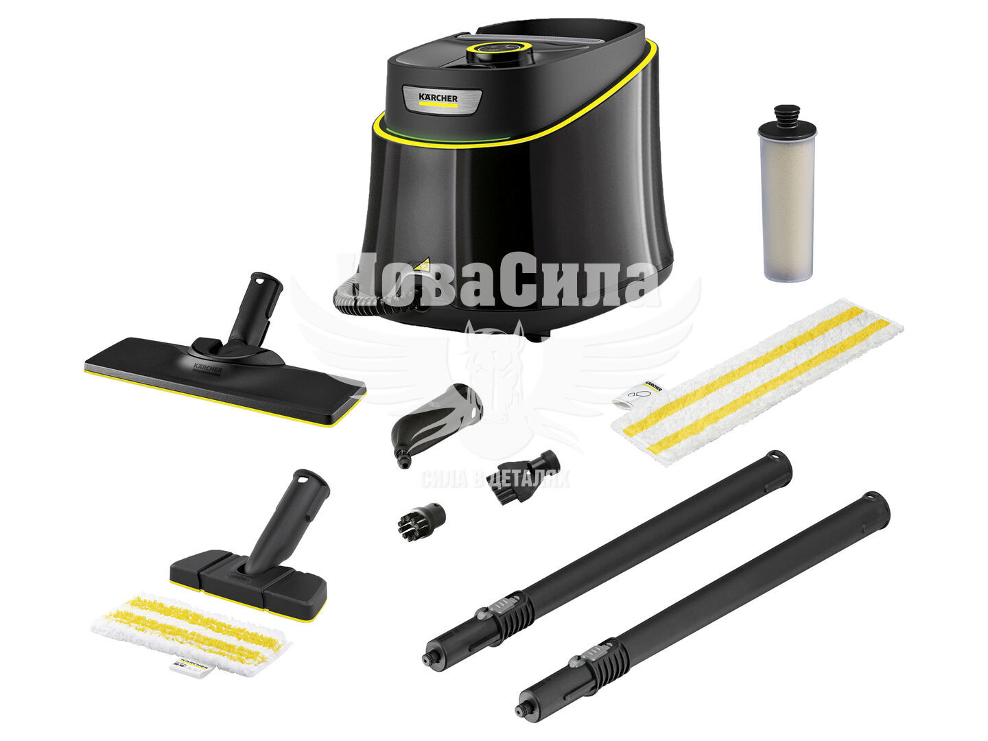 У наборі: серветка EasyFix для підлоги, антинакипний картридж, точкове сопло, гнучка ручна насадка, мала кругла щітка, щітка для швів, насадка EasyFix, 2 трубки по 0,5 м, паровий шланг із пістолетом (2,2 м). Оснащення включає запобіжник, клапан, регулятор пари та інтегрований вимикач.