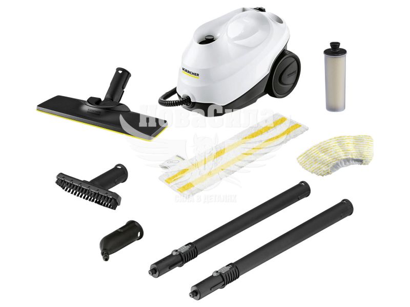 У наборі: серветка EasyFix для підлоги, обтяжка з мікроволокни, антинакипний картридж, точкове сопло, ручна насадка, кругла щітка, насадка EasyFix, 2 трубки по 0,5 м, паровий шланг із пістолетом (2,2 м). Оснащення включає запобіжник, клапан, регулятор пари та вимикач.