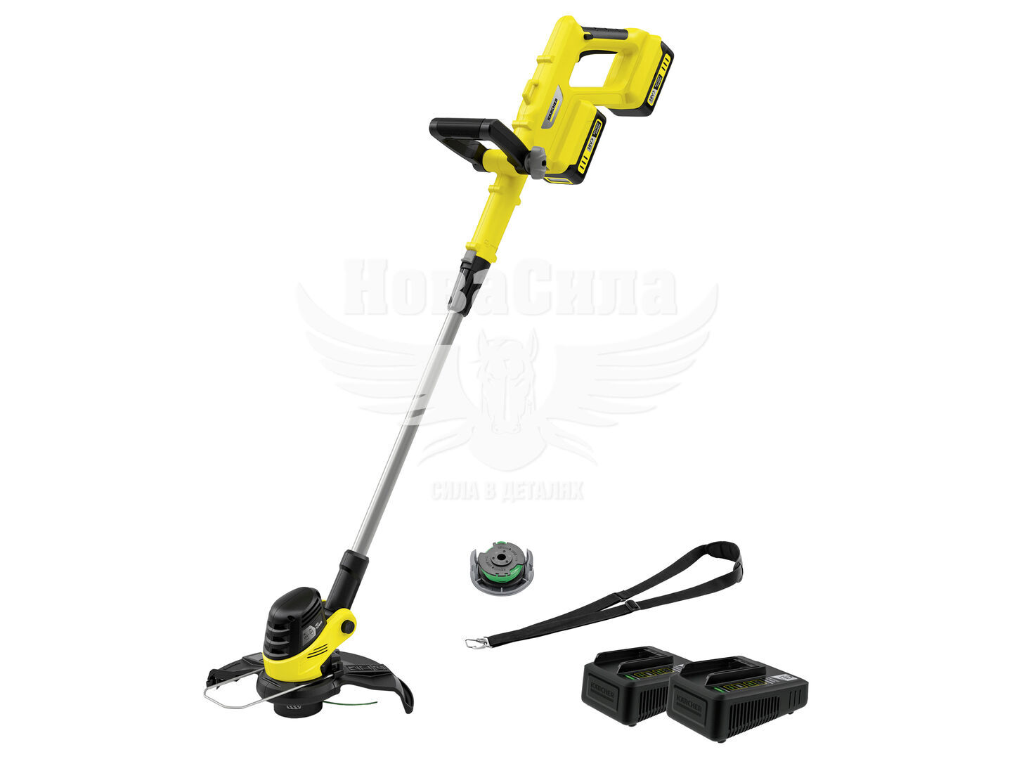 Технічні характеристики включають діаметр різання 30 см, частоту обертів 8000 об/хв і час роботи до 70 хвилин (з батареями 5,0 Ач). Вага без аксесуарів становить 2,42 кг, а з упаковкою – 5,97 кг. Розміри (345 х 350 х 1285 мм) і яскравий жовтий колір роблять триммер зручним у використанні та зберіганні. У комплекті – плечовий ремінь, катушка з лескою, додаткова рукоятка та захист рослин.